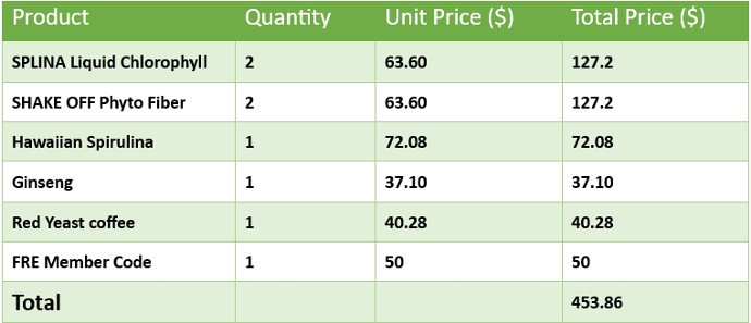 The products in the pack perfectly complement each other. For instance, liquid chlorophyll (SPLINA) and fiber (SHAKE OFF) work together to cleanse your system, while spirulina, ginseng, and Red Yeast Coffee provide essential nutrients and energy to revitalize and strengthen your body. The FRE Member Code offers exclusive benefits that support your wellness journey.